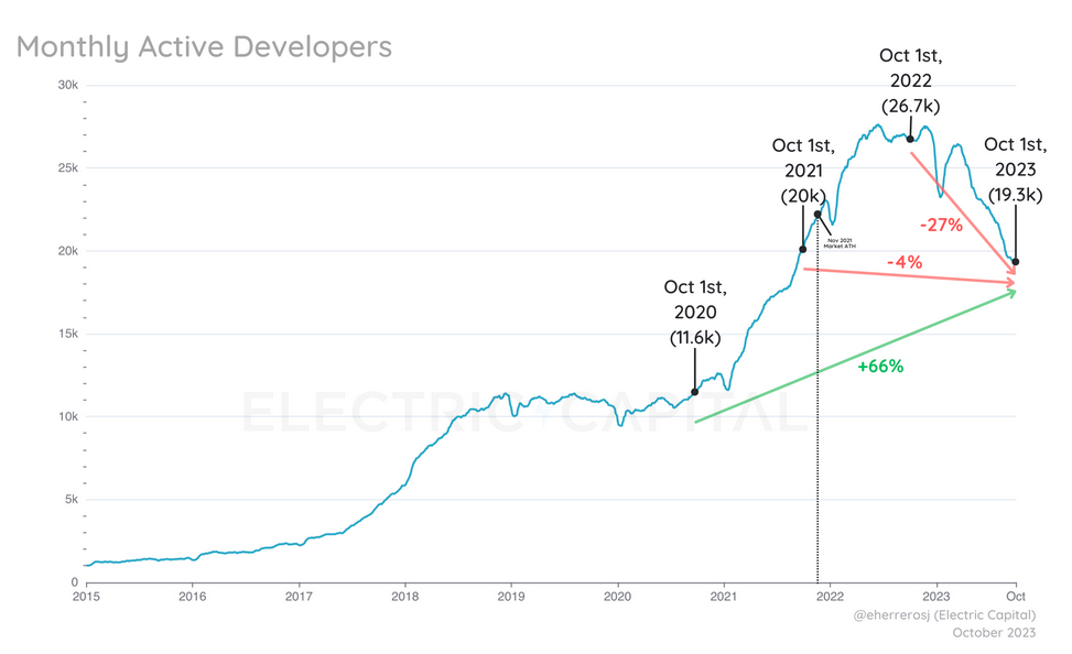 Data from Electric Capital's updated developer report, covering the period up to October 1, revealed a 28% year-on-year decline in monthly active developers across the crypto landscape. Ethereum and Polygon, for instance, saw their developer counts drop by 23%, 43%, and 57%, respectively, during the same period.